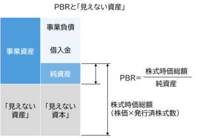 PBR1倍を下回ることもあるトヨタは、日本企業の市場評価の低さの象徴として、しばしば話題になります。一方で、テスラのPBRは約30倍となっています。一般的にPBRが1倍を上回る部分には、企業の財務諸表に表れていない「見えない資産」の価値が反映されていると考えられます(下図ご参照)。テスラの場合で言えば、「見えない資産」は、いまだ顕在化していない電気自動車の開発力、生産能力、技術力かも知れません。あるいは、カリスマ的な経営者であるイーロン・マスクCEOという人的資本の価値かも知れません。