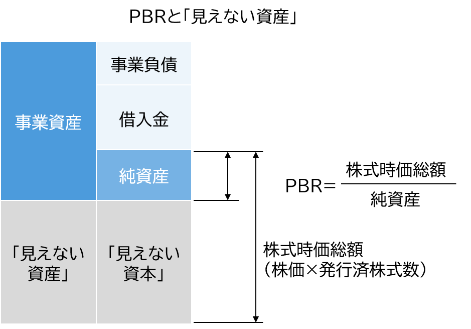 PBR1倍を下回ることもあるトヨタは、日本企業の市場評価の低さの象徴として、しばしば話題になります。一方で、テスラのPBRは約30倍となっています。一般的にPBRが1倍を上回る部分には、企業の財務諸表に表れていない「見えない資産」の価値が反映されていると考えられます(下図ご参照)。テスラの場合で言えば、「見えない資産」は、いまだ顕在化していない電気自動車の開発力、生産能力、技術力かも知れません。あるいは、カリスマ的な経営者であるイーロン・マスクCEOという人的資本の価値かも知れません。