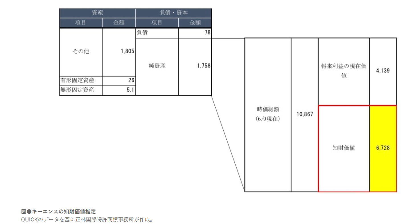 キーエンスの2020年3月末時点の純資産は1.7兆円であった。ここから、PBRが2.35倍というのを基に計算すると、キーエンスの将来利益の現在価値は4.1兆円となる。一方、2020年6月9日時点の時価総額は10.8兆円なので、差し引き6.7兆円が知財価値となる(図)。
