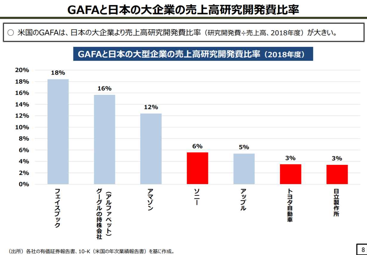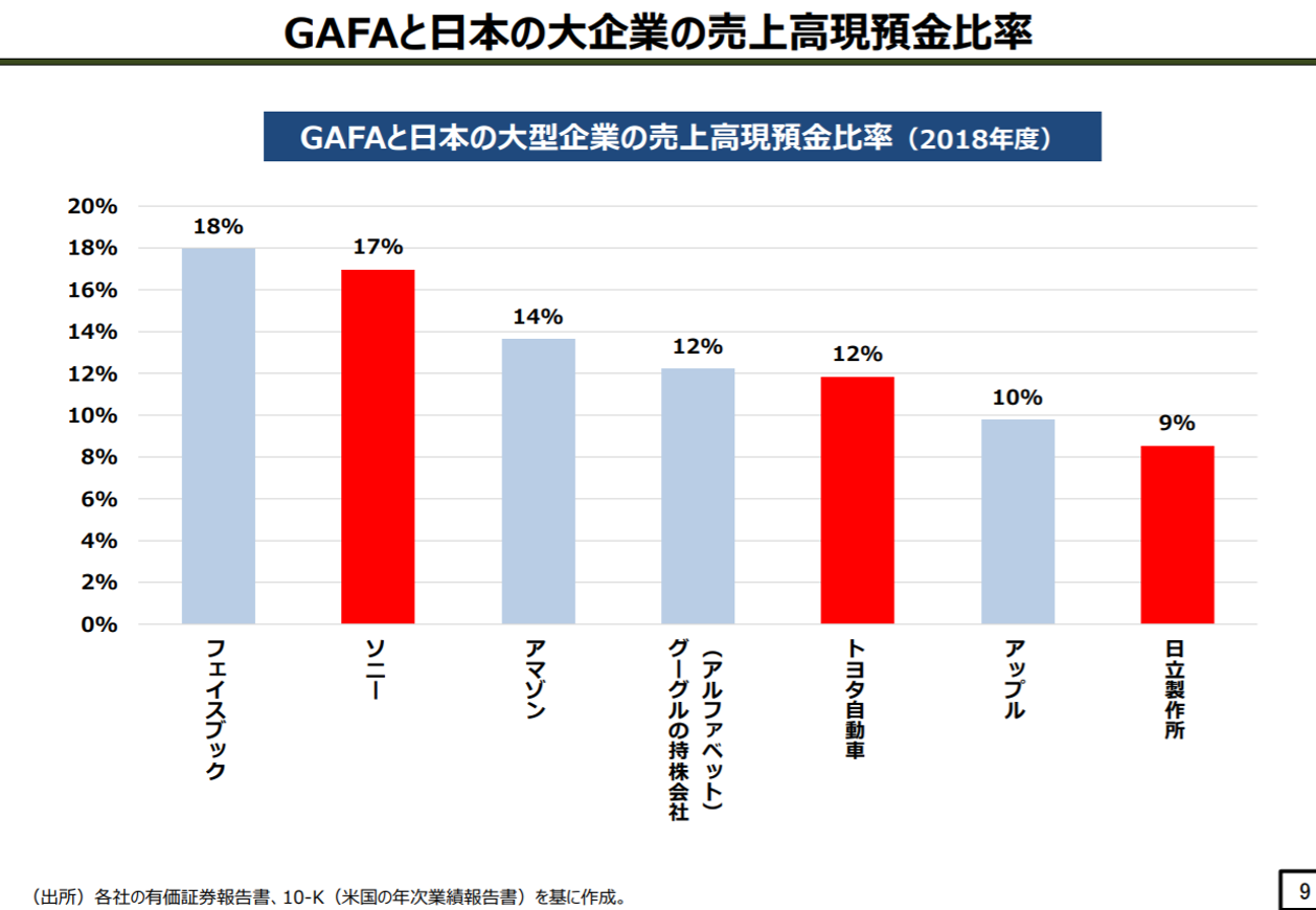 一方で、売上高に占める現預金の割合をみるとGAFAと日本の大企業とそれほど変わらないことがわかるのです。つまり、手元に現預金はあるものの、それを十分に研究開発などの未来投資に活用することが出来ていないことが見てとれるのです。