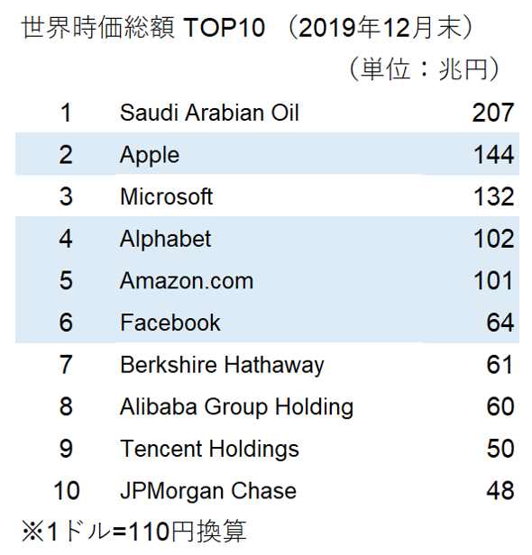 2019年12月末時点の世界時価総額トップ10は以下の通りです。GAFA4社の時価総額はアップル144兆円、アルファベット(グーグル)102兆円、アマゾン101兆円、フェイスブック64兆円の合計411兆円となっています。