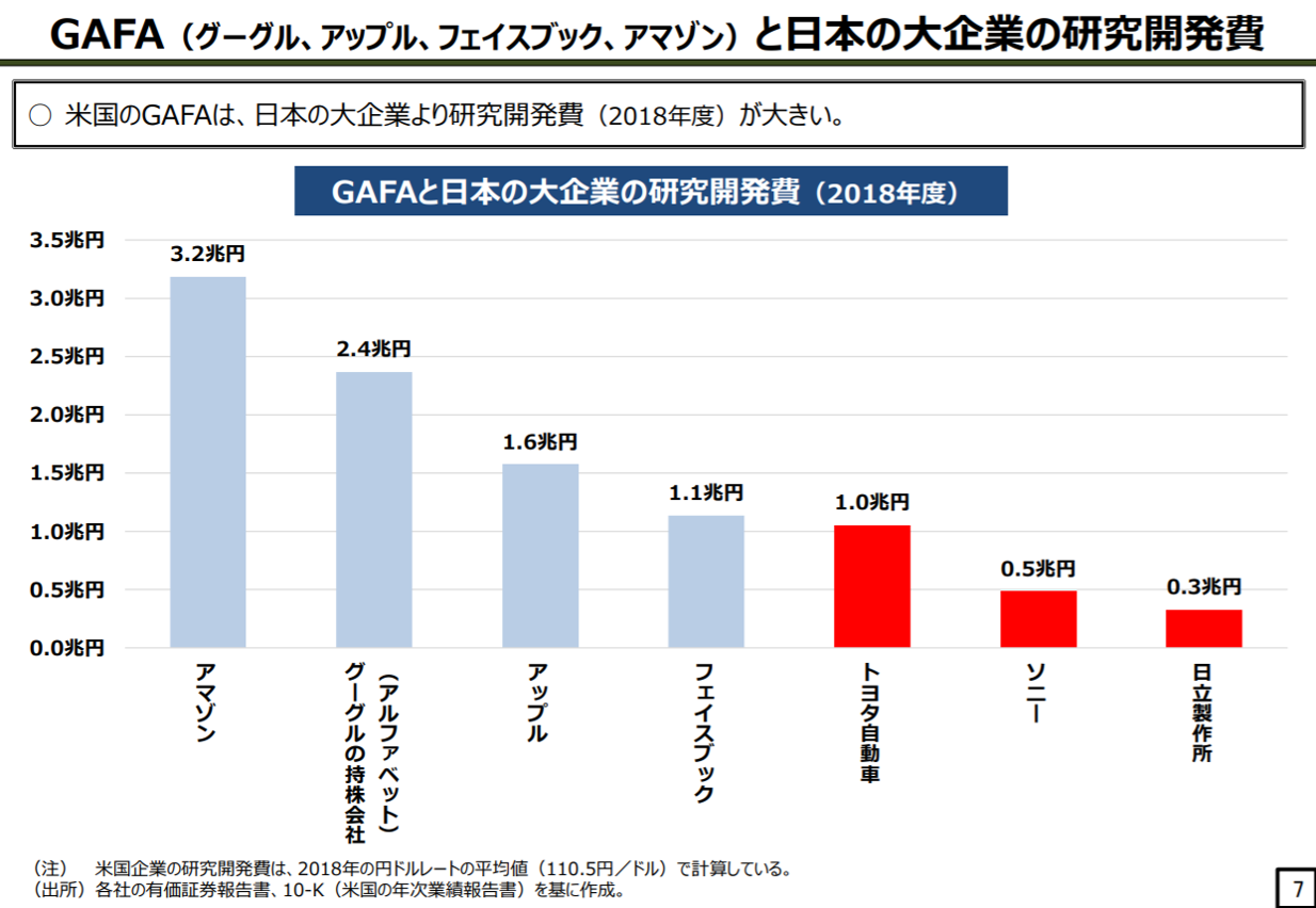 さらに驚くべきは、GAFA各社の旺盛な研究開発投資の実態です。下図はトヨタ自動車、ソニー、日立製作所など日本を代表する大企業との比較です。トップのアマゾンの研究開発投資は3.2兆円と日本でトップのトヨタ自動車の3倍以上です。とは言っても、売上高などの規模の違いがあるので、単純に研究開発費の金額をそのまま比較しても意味はありません。