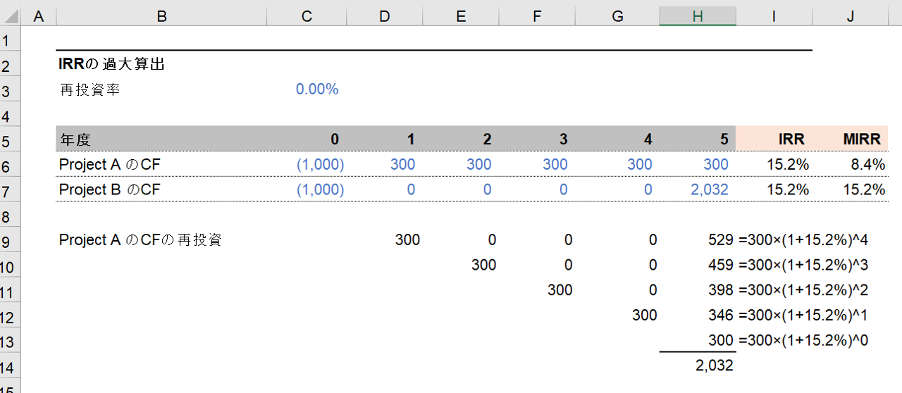IRR関数では、事業から得られたキャッシュフローは、事業終了までIRRと同率で再投資されます。上図にあるように、事業年度1から4に得られるキャッシュフローを年率15.2%で再投資すると、その総額は年度5には2032になります。これはプロジェクトBと同じキャッシュフローになるのです。