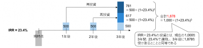 そして、2年目に得られるであろう500のキャッシュをプロジェクト終了まで1年間23.4%で運用すると617になります。3年目に得られるであろう500との合計は1,878になります。この1,878という数字は、初期投資1,000を23.4%で3年間運用した場合の将来価値になるわけです。