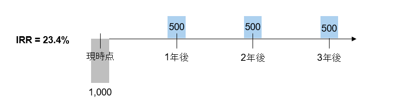 まずは、下図をご覧ください。今1,000という投資を実行し、1年目から3年間にわたり、500というキャッシュが獲得できるというプロジェクトがあるとします。このプロジェクトのIRRは23.4%となります。