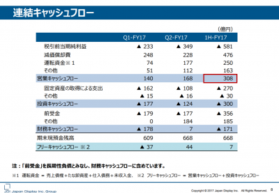 IR説明会資料では、同社の上半期の営業キャッシュフローは、308億円になっていることがわかります。これは、設備投資のためあらかじめ顧客のスマートフォンメーカーなどから受け取る「前受け金」の増減を営業キャッシュフローではなく、財務キャッシュフローに含めているからです。