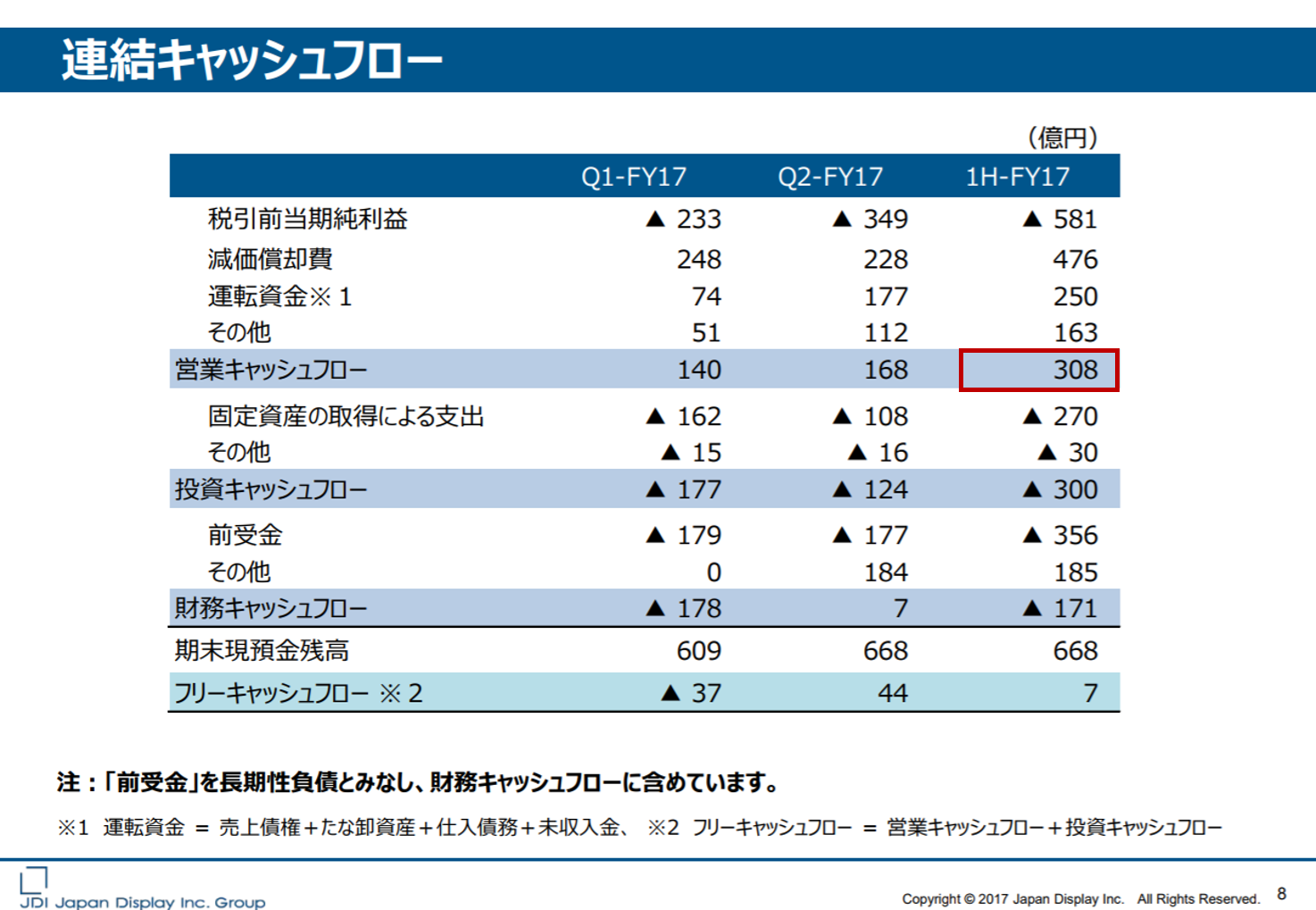 IR説明会資料では、同社の上半期の営業キャッシュフローは、308億円になっていることがわかります。これは、設備投資のためあらかじめ顧客のスマートフォンメーカーなどから受け取る「前受け金」の増減を営業キャッシュフローではなく、財務キャッシュフローに含めているからです。