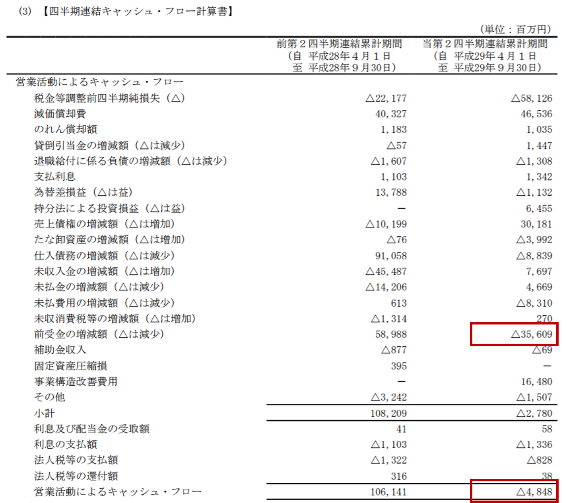 一方で、法定開示の四半期報告書では、従来通り、「前受金」の増減△356億円は、営業キャッシュフローに記載しています。これにより、同社の上半期の営業キャッシュフローは、△48億円になっているのです。営業キャッシュフローがマイナスというのは一大事です。