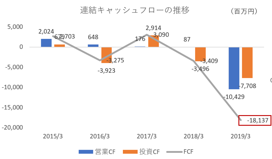 依然としてRIZAPグループの経営が大ピンチであることには変わりはありません。93億円の構造改革関連費用の大部分が資産の精査であってキャッシュアウトではないとわざわざ発表しています。それなのに、2019年3月期の営業CFは▲104億円なのです。さらに投資CFは▲77億円ですから、同グループのFCFは▲181億円となります。