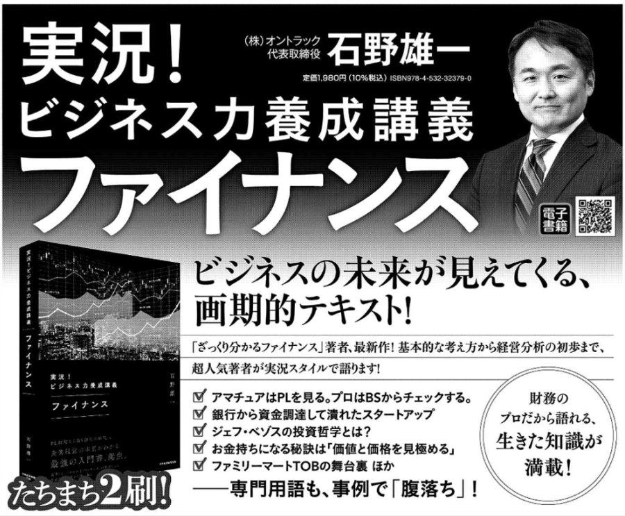 「実況! ビジネス力養成講義 ファイナンス」の広告が本日の日経新聞に掲載されました。おかげさまで早くも増刷です。有難うございます。皆さんの大切な友人や同僚・部下にもお薦めくださいますでしょうか。引き続きご愛顧のほど、よろしくお願いいたします。